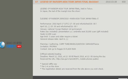 Incidentally, if you wish to check out Rain’s official site or the official LoR site yourself, you must view the Korean versions of both to see the notices, as they are not listed on the outdated English versions. We suppose J.Tune thinks that because we are American, we have no interest in Rain’s overseas schedule.