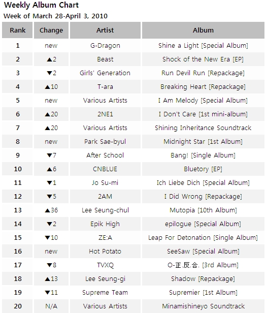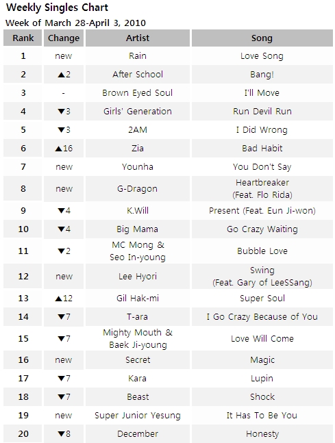 WATCH MOVIES (Movies, Pictures, & News) 4/8/2010 — There are new leaders in the Gaon weekly album and singles chart this week. G-Dragon clears the competition debuting at number 1 with his Shine A Light concert DVD. Rain also debuted at number 1 at the singles chart with his song “Love Song”.
