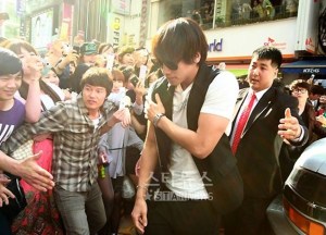 …Things went on smoothly for his first fan signing where he wore a mesh-like outfit coupled with sandals. But things got slightly out of control in the second fan signing as the security failed to hold back the swarm of people when he arrived in his vehicle….