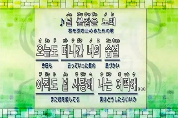 This appears to be an NHK Japan Entertainment spot that is deconstructing Rain’s Love Song 널 붙잡을 노래 (Neol Bootjabul Norae) and teaching it word by word in Korean to Japanese viewers. All together now… nanneun ohdukkae. Nanneun ohdukkae. Ha—very cute! — Stephe ^@@^