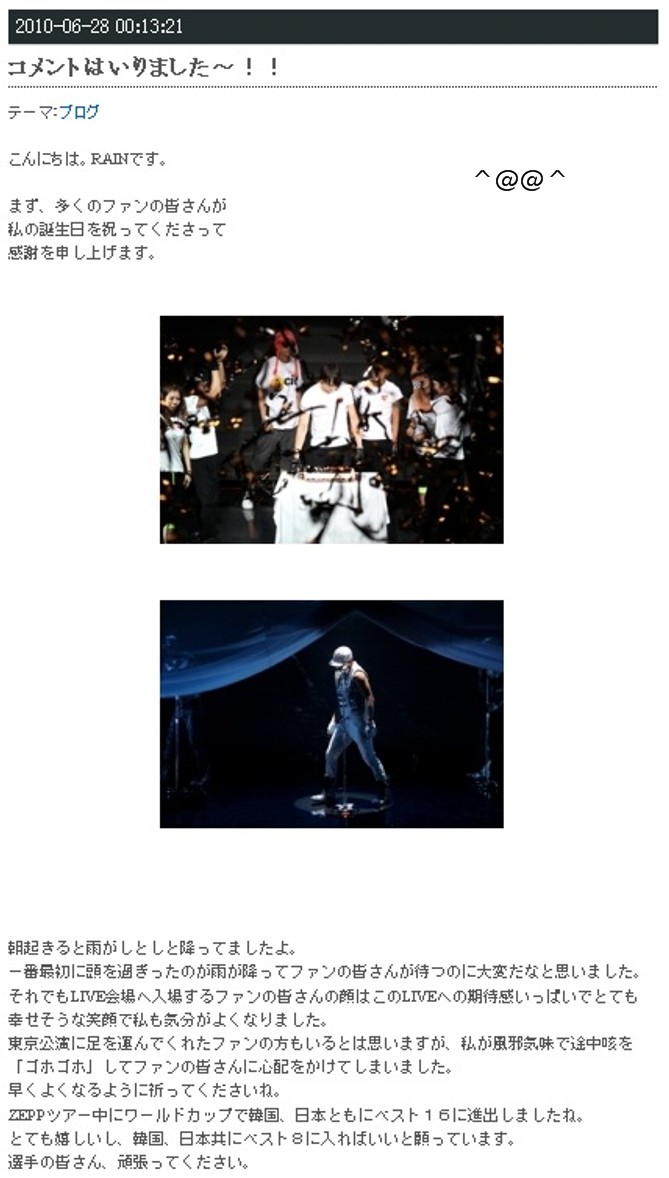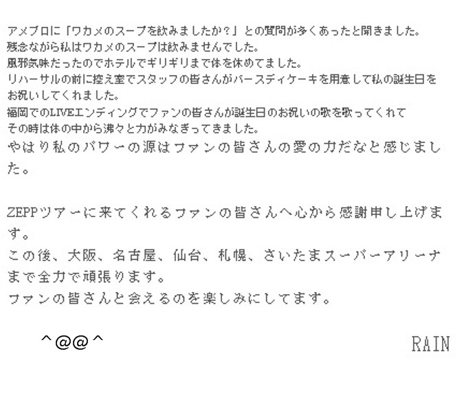 Rain’s personal message on the Rain Official blog (Japan).