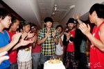 According to Cloud Master, Rain’s staff and Crew threw him a nice, casual belated birthday bash/World Cup-watching party on the road to ZEPP Osaka this weekend.  Certainly a good time was had by all.  Good show, gang.