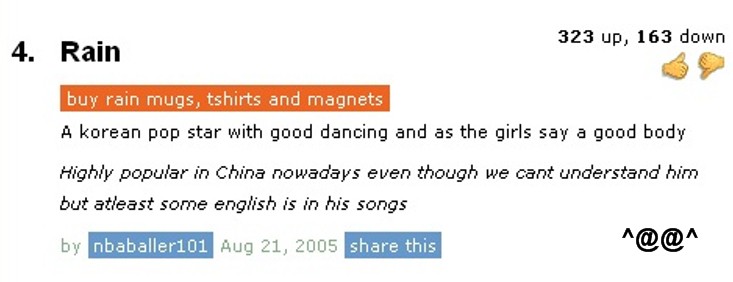 MBLAQ gets a GREAT write-up in the Urban Dictionary, while Rain only gets… this? Seriously, people?  WTH.  That’s cold! LOL!