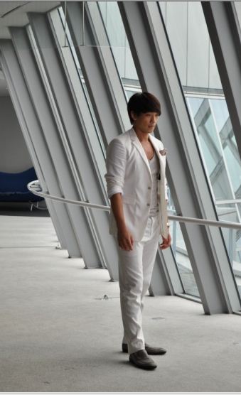 Jioon looks good in the white suite. And he looks relaxed by the pond.