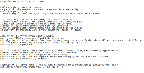 Thank for the translation Cuckoo and Cloud USA!!! You alway keep us informed and we love you for that. AWWWW!!! JiHoon is so nice and adorable. His love for we Clouds is palpable and so touching that makes me cry. That’s why we love him soo much!!! Our relashionship is very strong and no matter what, we Clouds are going to be there for him. Just feel the love and embrace it cause is raining on us!!!!