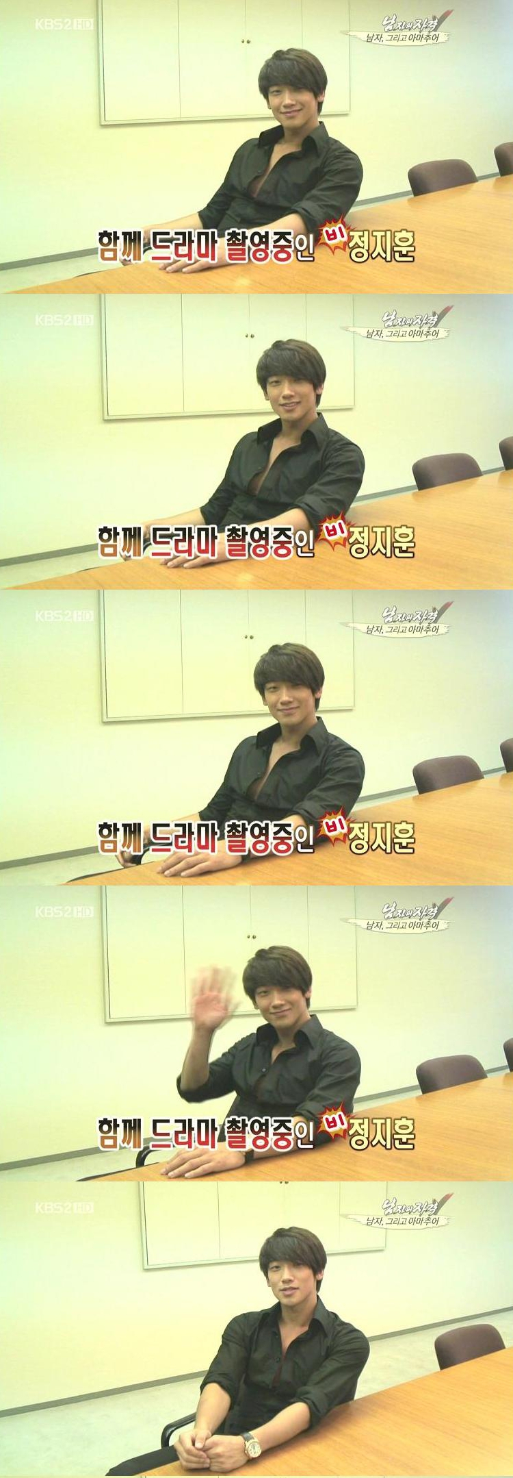 Rain’s quick stint on KBS  2’s Men’s Qualifying show, in support of Lee Jung-Jin.  More ridiculous handsomeness.  (source blog: OnlyRain)