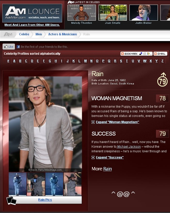“As tempting as it is to dismiss an entertainer who calls himself Rain by choice, we can’t ignore his success and, shockingly, we support it. Unlike many of his competitors, Rain isn’t a manufactured phony. He survived a difficult childhood and a slew of industry rejections on his bumpy road to success. In a refreshing change of pace, he’s perfectly willing to make fun of himself, as his spirited 2007 appearance on The Colbert Report demonstrated. Are you listening, Kanye West?”