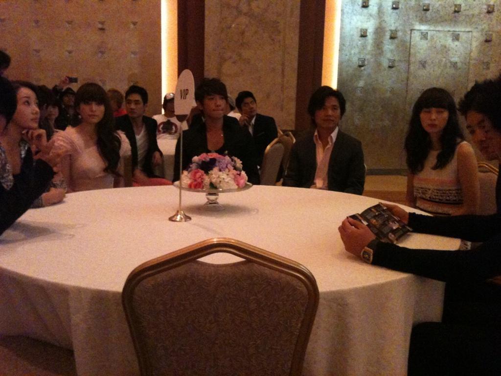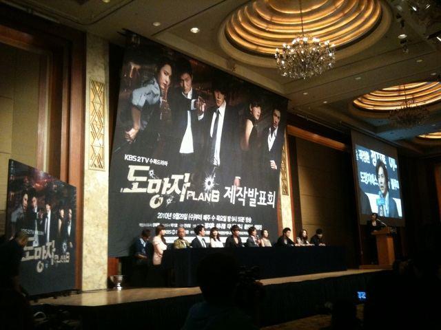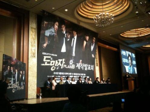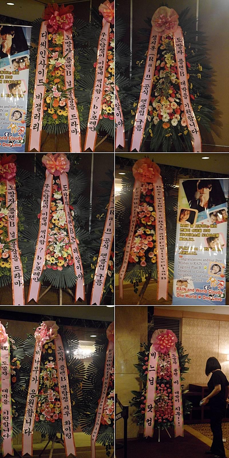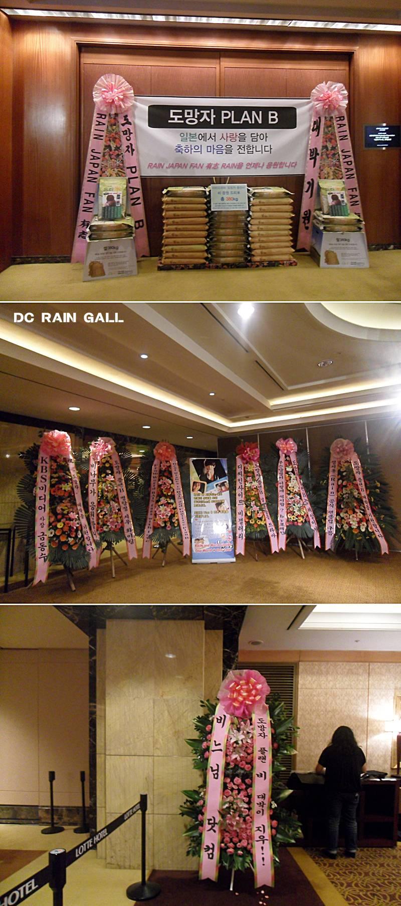 Our collective Project 도망자 (Runaway): Rain and World Clouds—One World, One Love congratulatory and charity banner made it outside the September 27th Runaway/Fugitive press conference at the Lotte Hotel with all the other banners and garlands, and it looked fabulous.