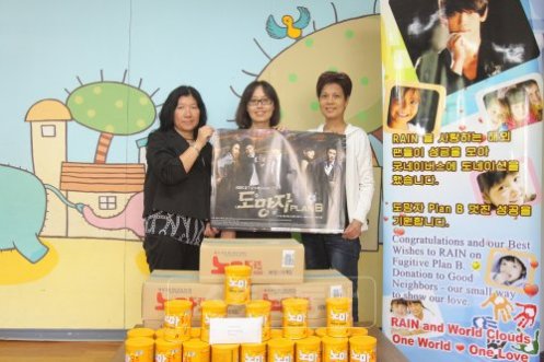 [A small portion of] Rain’s overseas fandom consisting of more than 80 members from 12 countries such as the USA, Canada, Germany, Italy, Poland, Japan, China, the Philippines, Viet Nam, Malaysia, etc, including Korea, contributed 5,000,000 KRW in cash & 7,000,000 worth of children’s nutritional supplements [around $10,508. total in U.S. dollars] to the GOOD NEIGHBORS fund on September 28th, in celebration of the first broadcast of KBS 2 TV’s new drama “The Fugitive Plan B,” where Rain has the starring role. This donated money will be used to help underprivileged children.