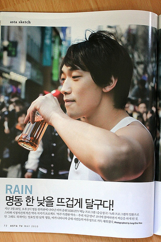 Enjoy these beautiful ASTA TV magazine images from back in May, when Rain and the Men wrestled in the streets of MyeongDong, Seoul and laid The Smackdown on some huge University athletes. (As I recall, a few Clouds were close enough to Rain to have reached out and touched him. Wow.)