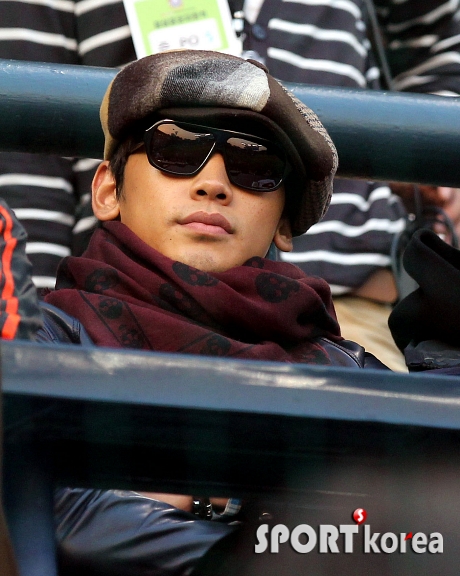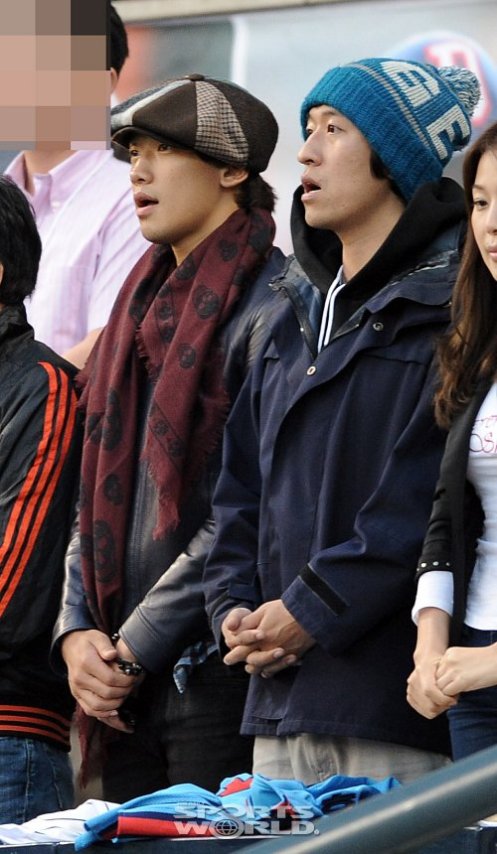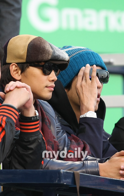 The Rain Blogosphere was abuzz yesterday when pictures of Ji-Hoon and close friend rapper/photographer Bbaek-Ga (of Koyote fame) were spotted in the audience at the pro-baseball 5th place playoffs at Jamsil Stadium on October 5th.