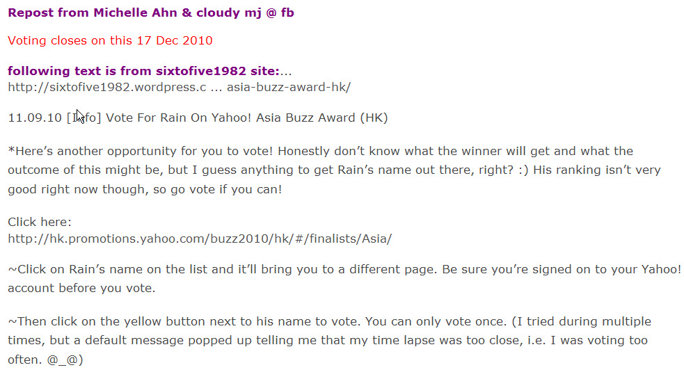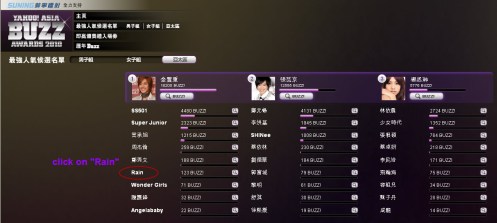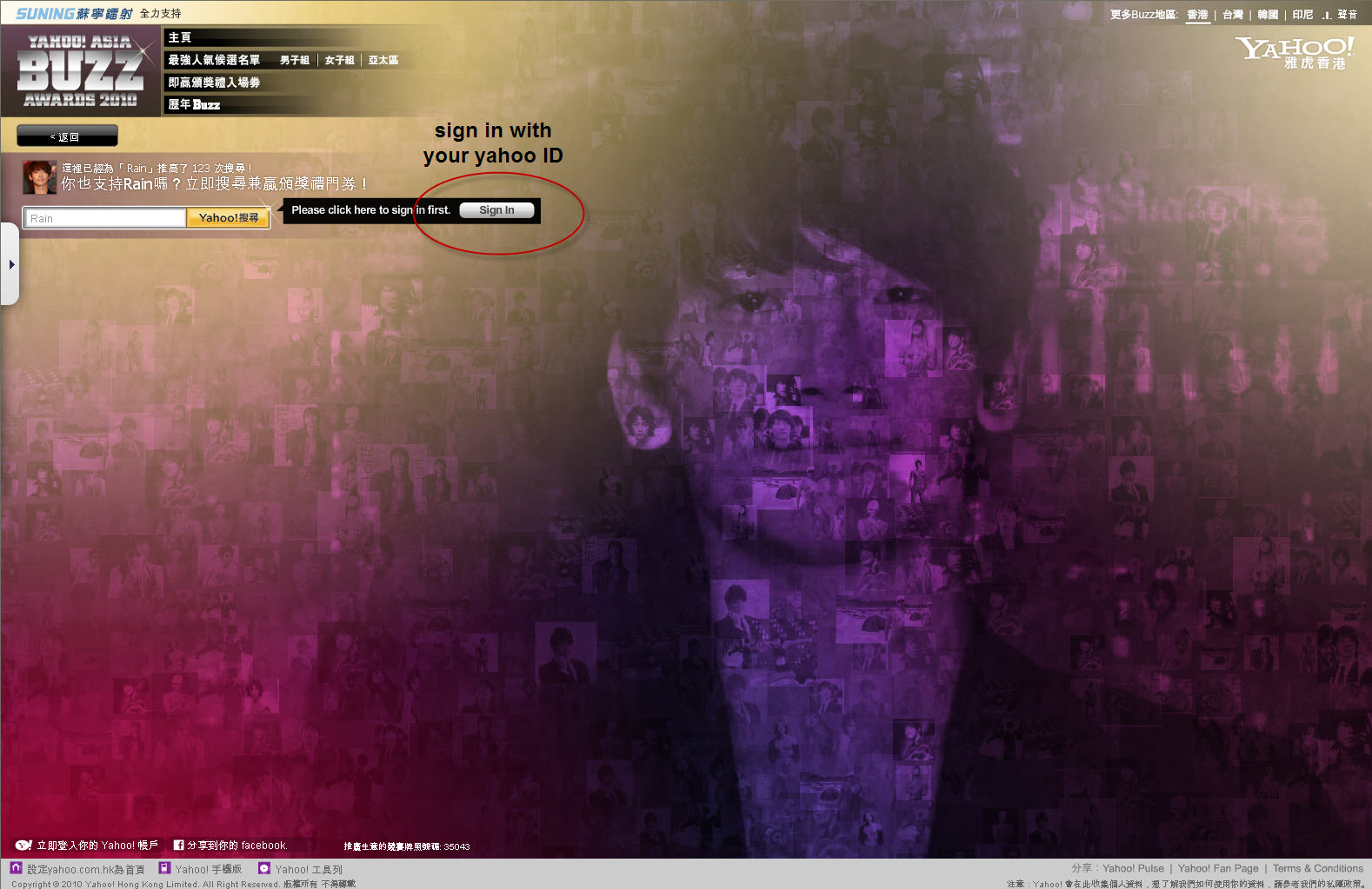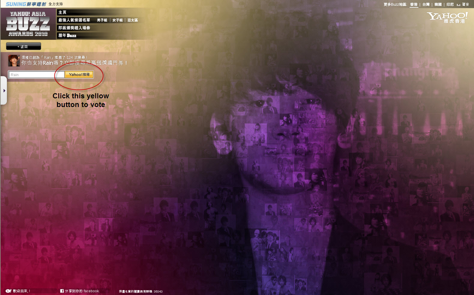 And if you’re a Yahoo! user, you can vote Rain in as a 2010 Buzz Star, thanks to the diligence of fans Michelle Ahn and Cloudy MJ on Facebook. Their source of information (the following text) is from sixtofive1982. The instructional screen captures are courtesy of cloud Scorpiola.