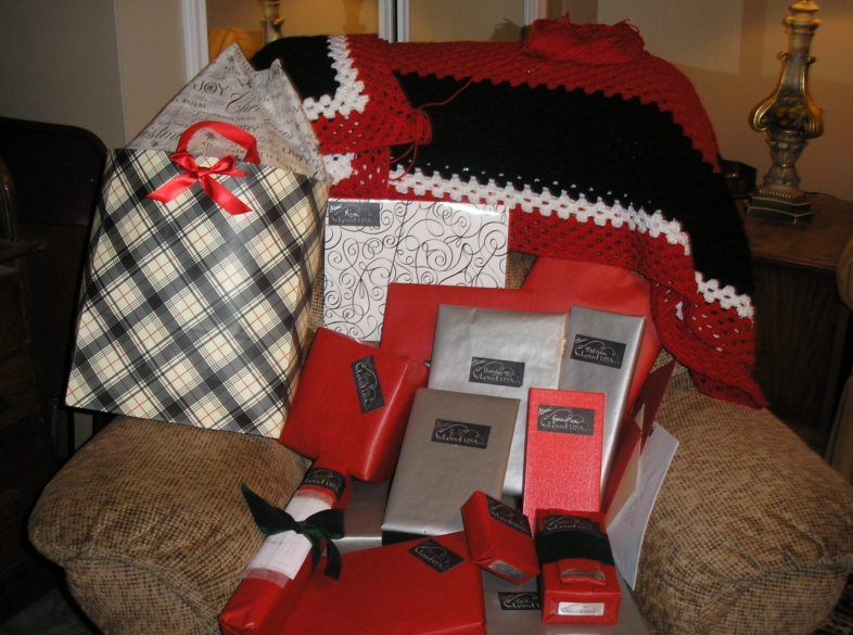 Everything looks so lovely in the pics! That afghan is so nice! 3 weeks… I cannot imagine. The gifts are so cool and the wrapping paper is extra professional looking and all. He’s going to be so surprised when he gets that box. I really wish we could see his face when he opens it, ya know??
