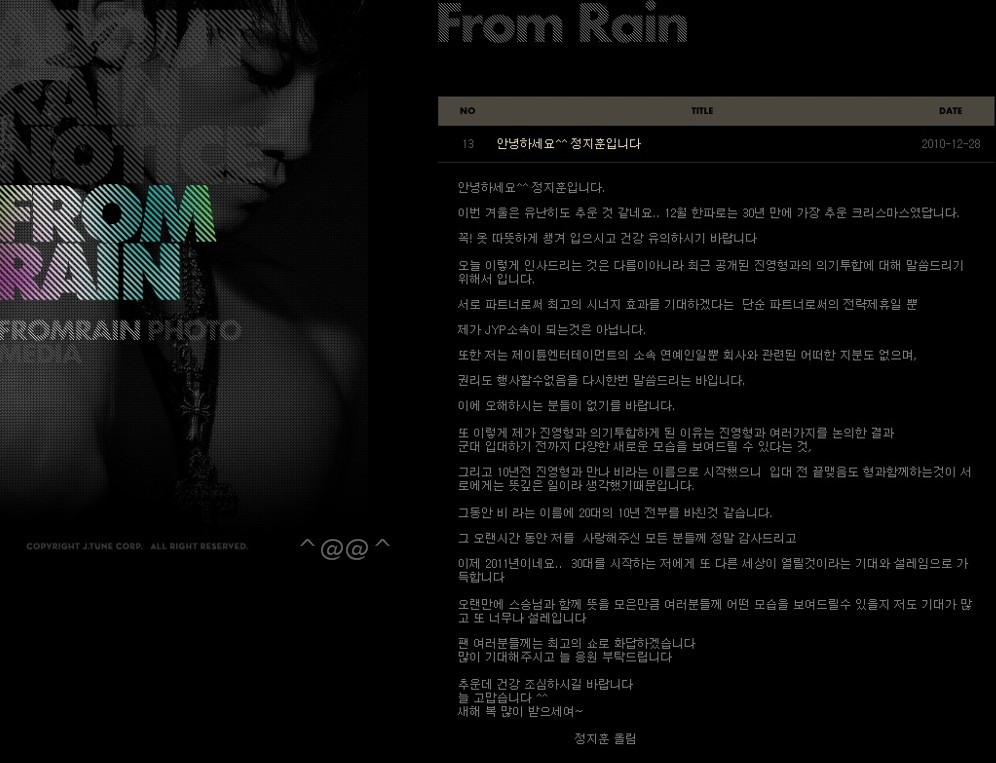 The message was actually posted on his official website and it was in Korean. Of course, it was not posted in ENGLISH on the ENGLISH side. The notices on English side of his official website haven’t been updated since April 2010. The Messages “From Rain” haven’t been updated since March 2010.