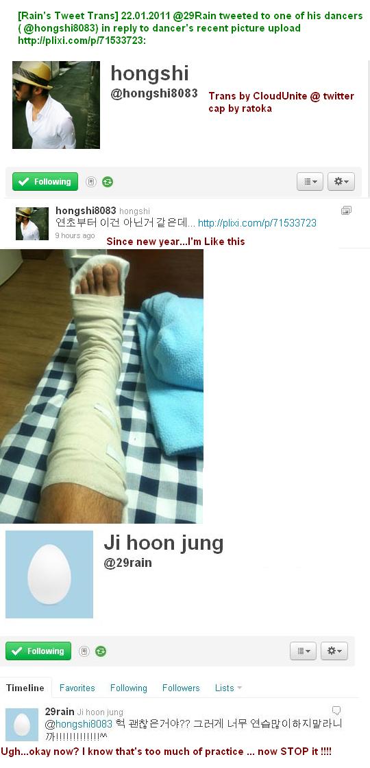 don”t party to much u are type person love to party please stay away from the hurt listing to rain and get well and recover soon ok!! poor baby that was good to see u are a dancer too becareful next time took care yourself ok oh i wanted to thank u for everything with rain and we and rain just about as worries to u too ..