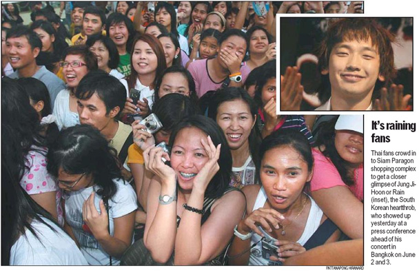 This is a shot from three and a half years ago, out of the Bangkok Post, of what happened the last time Rain hit Thailand, in June 2007. Something tells us the frenzy this time will be just as large, if not larger! 🙂