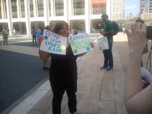 I hate signs, so I politely declined when Stormy whipped out the ones for her, Tara, and Diva. I was tweeting updates on my phone constantly, until almost 7 pm(when people would start arriving for the gala). » It was during that time that we caught the attention of YTN reporters, and they interviewed Stormy and Tara about Rain! I was standing near Stormy, but I hate video cameras more than signs so I didn’t get in the lens’ eye. Another reporter took our picture (all of us)—I don’t remember who they were. We spoke to several people, some tourists who had no idea what was going on but found it interesting to see. We met up with a new girl who was shy to approach us at first but stayed with us throughout the end. Stormy gave her a sign. 🙂