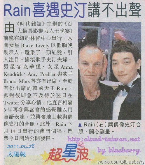 Rain’s Tweet about dinner with Sting, as covered by The Sun Hong Kong. (image credit: as tagged / Bi Blueberry @Daum)