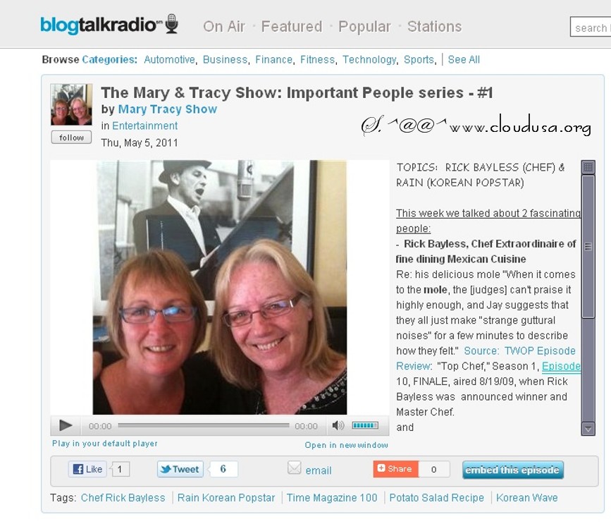 [Cloud USA 5/6/11] You read that headline correctly, fans! Mary A. Reed of Los Angeles, host of online talk radio’s The Mary & Tracy Show, and her guest host Noreen Brown started off their very first Important People series installment yesterday, on May 5, with two men that they find influential and absolutely fascinating—Rain and Chef Rick Bayless.
