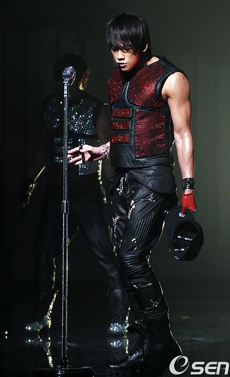 (Rain goes all Red Bling and Golden Abs at an M!Countdown “Love Song” performance last May 2010. This kind of Swarovski Crystal hotness comes only once or twice a millennium, folks. IF then.)