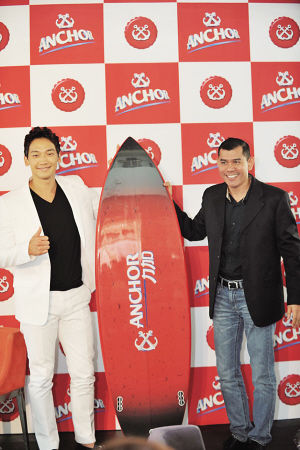 (Image: 163 News.) Rain, left, with the Commercial Director Edmond Neo Asia Pacific Breweries.
