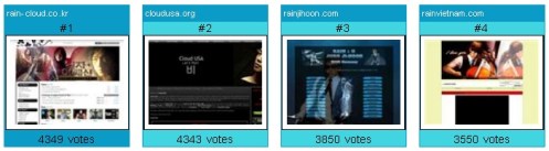 Rain VietNam came in at #4, RAIN Germany finished at #3, Cloud USA made a strong showing at #2, and the official Korean Cloud took top honor as Best Fansite for June 2011—by 6 votes. Isn’t that something? If the world didn’t know that Rain’s fan base spreads to the four corners of creation, they know it now. Congratulations, sisters! We’re so excited.