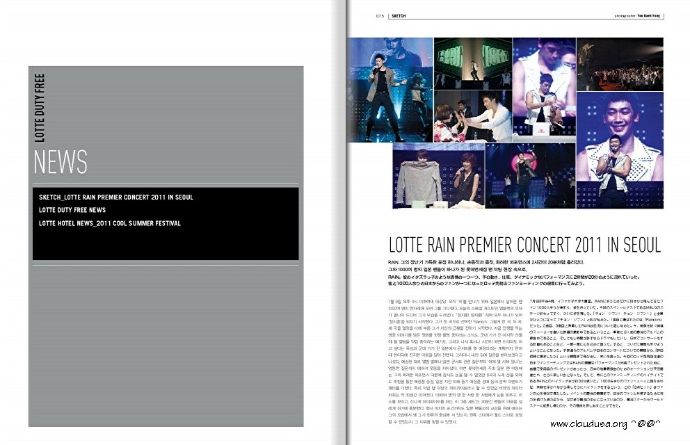 In this month’s Lotte Duty Free Global Lifestyle Magazine for August 2011, LDF did a nice mini-spread on the Lotte Rain Premium Concert 2011, the fan meet back on July 9 where Japanese fans flew to Seoul and got to see JiHoon for a final time before his enlistment.