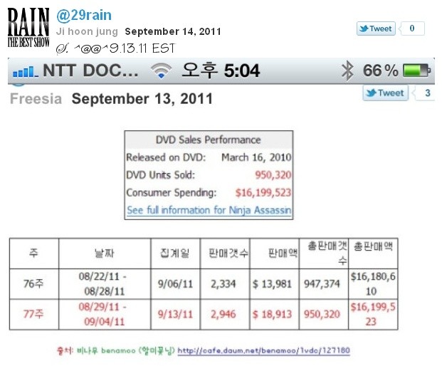 [ETA Eng trans] Tweets abound: Ninja Assassin DVD sales to date.