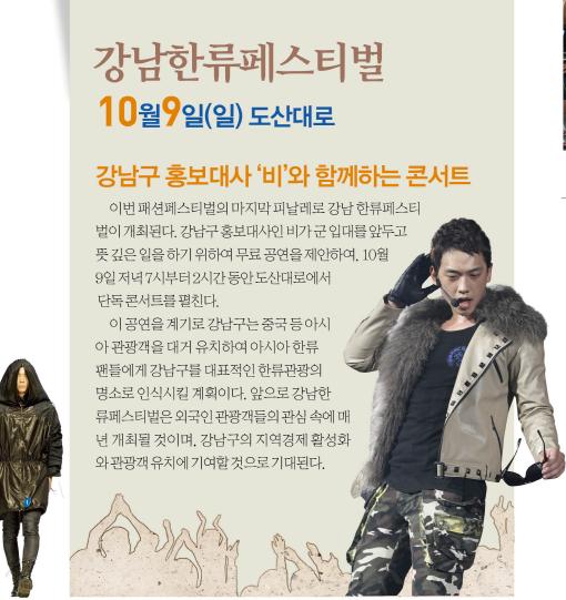 10월9일에는 2011년 패션페스티벌 연계행사로 한류스타 “비”와 함께하는 콘서트가 개최됩니다. 장소는 삼성동 영동대로 코엑스 앞이구요 19시부터 시작됩니다. twitpic.com/6quqnz