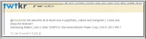 @CloudUnite We welcome all of whom love K-pop(Rain), culture and Gangnam:). Come and enjoy the festival!!! Samseong … http://dw.am/LiYTQ