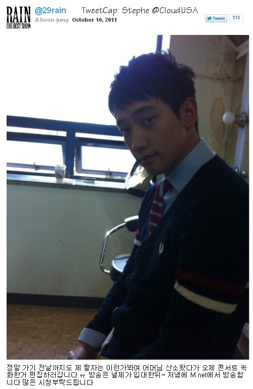 11. u so handsome in NEW CUT RAIN! no matter what Rain we here waiting u until day u cam back and took over again i am going to miss u everytime i thing of my about to cry T__T i will be wait to see this Mnet soon please be STRONG and do u best cloud LOVE U gosh even that rain still of his feet my he must keep until 111th he did even rest either don’t look like his express he seem not happy 😦 i will try stay up see u until end rain