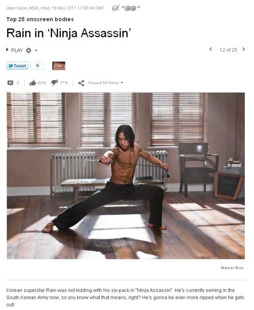 Yesterday, MSN Entertainment Malaysia put Rain in their Top 25 On-screen Bodies. We couldn’t agree more! “Raizo” was a Badass in more ways than one. And yes, no telling how many “packs” Rain will have when he gets out of the military. 🙂