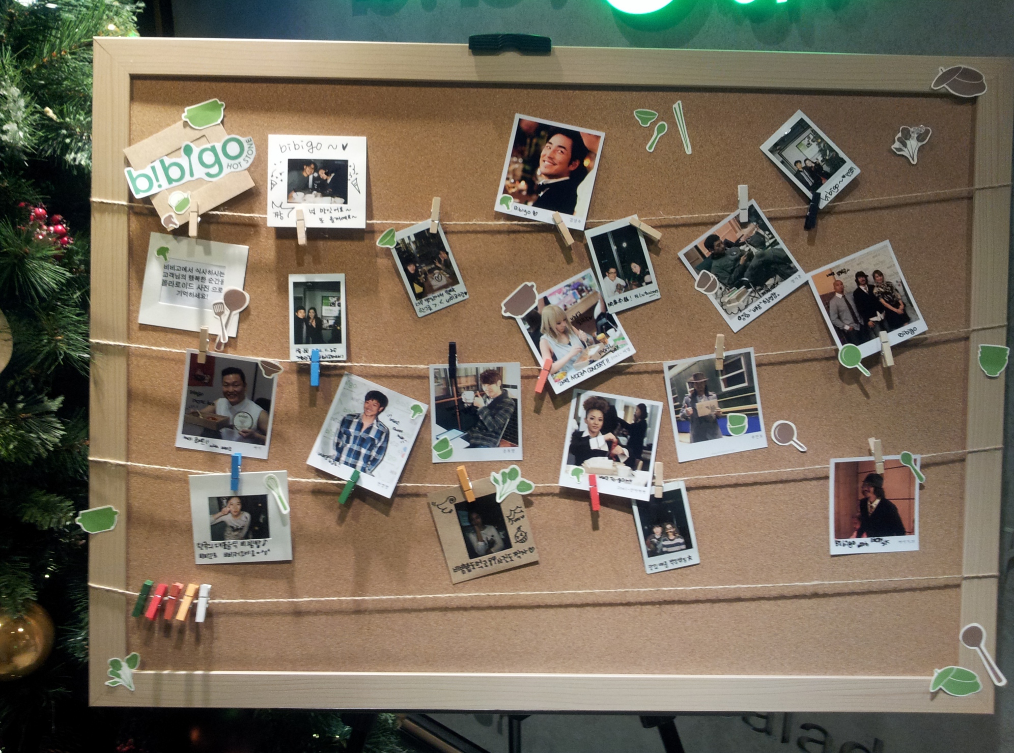 Tweeted by Bibigo Stone Kitchen yesterday, the kind folks who catered Rain’s birthday lunch on the Soar: Into The Sun set this past June. This collage, supposedly in one of their restaurants, has a picture from that day on it. Can you spot Rain in his “Lt. Jung TaeHoon” garb? 🙂 (Image credit: Bibigo Korea @Twitpic)