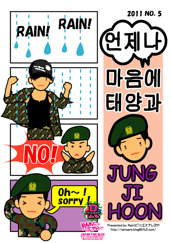 Undoubtedly one of the most adorable things I’ve ever seen—the Rain[eare] blog’s latest Rain comic. Number 5, in fact. So cute!! Kawai~!! かわいい! It starts raining one day… JiHoon, in his camos, suddenly breaks out into a “Nan” shower, out of habit. (He’s obviously suffered a brain fart and forgotten where he is.) His superior officer is mortified. “NO!” Rain puts his shirt back ON with a quickness. “Oh—sorry!” LOL! LMAO! 😛