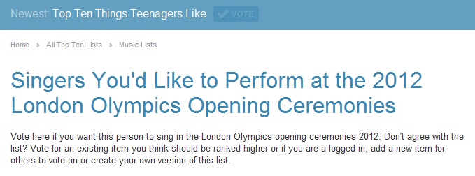 So vote. Right HERE. » Singers You’d Like To See Perform at the 2012 London Olympics Opening Ceremonies.