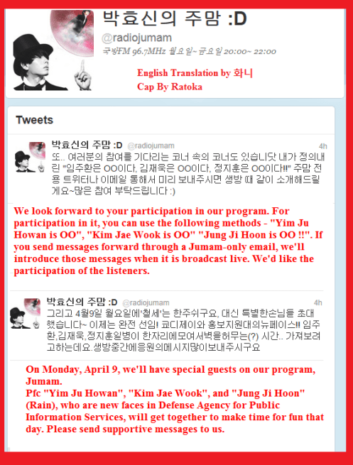 Various tweets from today and from 4/6, respectively. I’m listening to the radiojumam show live on Friends FM as we speak. Rain and his boys are talking up a storm and laughing like there’s no tomorrow. Talk about having a good time!