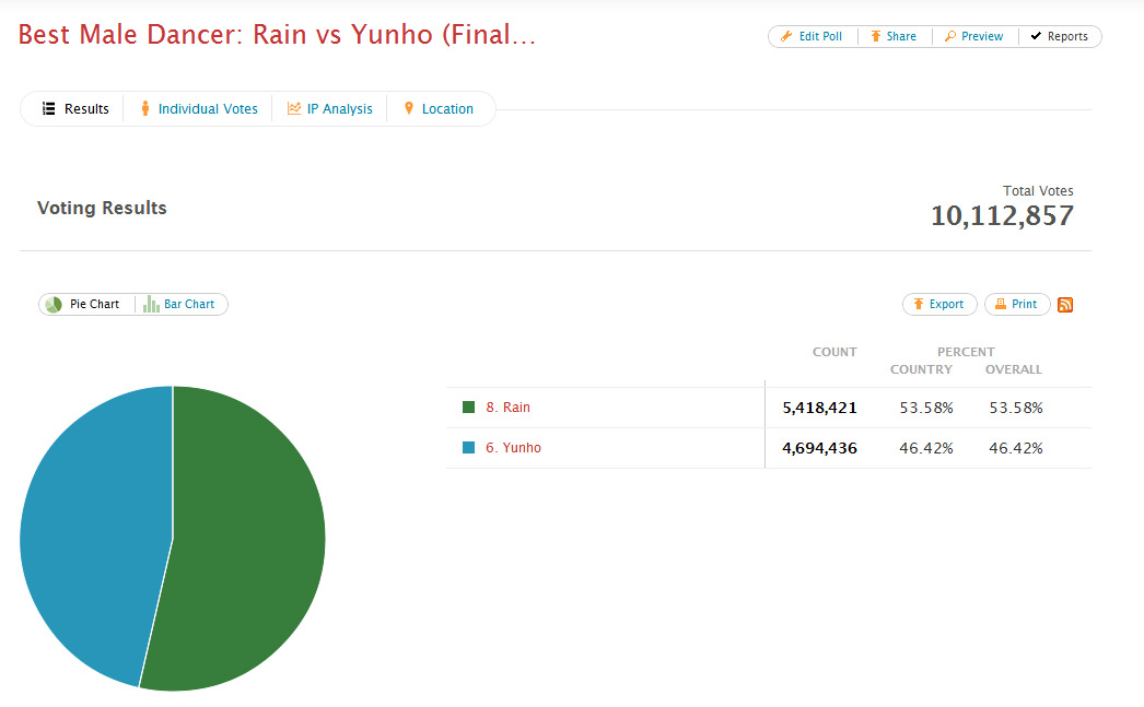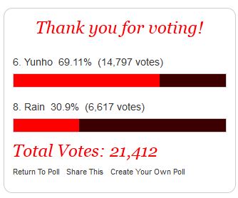4. Okay, the poll has obviously been compromised. It doesn’t matter if I vote for Rain or Yunho. Either way, Rain’s votes go down and Yunho’s go UP by at least 1000 votes. It’s insane.