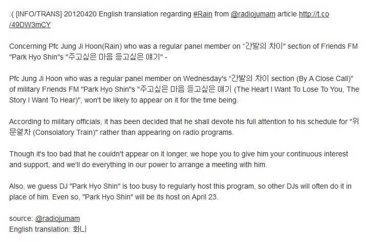 5 Responses to “[Rain update][DEMA] PFC JiHoon Jung to concentrate on Consolatory Train duties.”