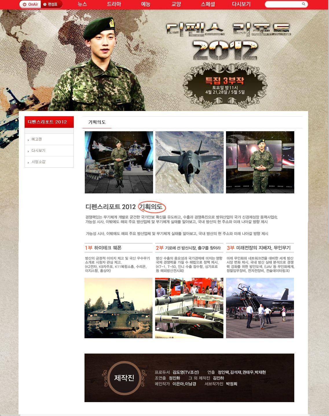 » The TV Chosun Program Guide Page, featuring The Defense Report 2012 hosted by PFC JiHoon Jung/Rain, is HERE on the TV Chosun site. The banner below reads: Defense Report 2012, Special Trilogy, Sunday night, May 5, 9:00. ^@@^