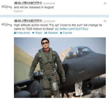 Immediate thoughts: While the R2B letters would look really exciting on the movie poster and grab people’s attention, and my mind loves the visual (think T3: Terminator 3, MIB3: Men In Black III, etc.), “Return To Base” leaves me sort of… flat. After all, when a pilot is “returning to base”, the immediate mission is usually over and he’s okay, moseying on back to headquarters, living to fight another day, so where’s the excitement. Seems anticlimactic. Even “Red Muffler” sounds more exciting because it represents a pilot’s scarf as he flies headlong into a fight. An F-15 returning to base is a lot less stimulating than an F-15 soaring towards the sun on an emergency. (Although after Rain’s character pulls the crazy-ass air show stunt that gets him into deep trouble, returning to base for punishment will be the last thing he’ll want to do. Haha.)