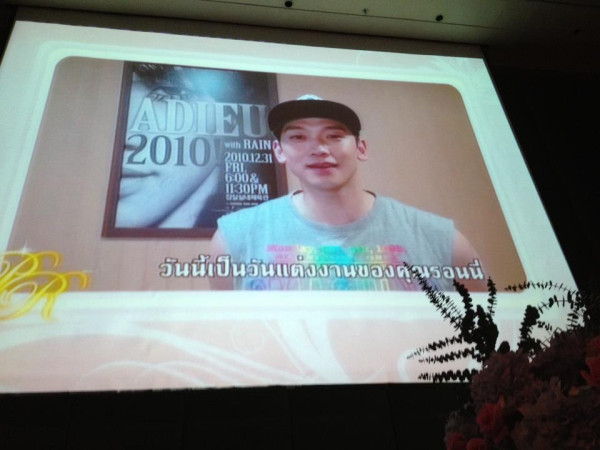 It seems that Ronnie and his wife got married back on May 25 in Thailand, and popular CABA Entertainment client BEAST/B2ST sang at that wedding (images on Ron’s Twitter and other Twitters out there can attest to that). Looks like Rain may not have been there for that ceremony, due to this image of him sending a congratulatory wedding message on May 25 (which, at the time it was posted on websites, said nothing about Ronnie at all, wow, just “Rain congrats message”… Really, folks?), and also due to the fact that he had a Family Month concert on the 24th and his radio show on the 26th and had no real time to travel.