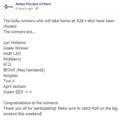 Tweets abound: CJ Entertainment America announces its R2B T-shirt winners.