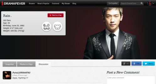 If you haven’t taken a look at Rain’s revamped biography on Dramafever HERE, then you really should. Bad grammar and punctuation aside, I love the fact that not only can you share Rain photos and clips there, but you can also “Become a Fan.”