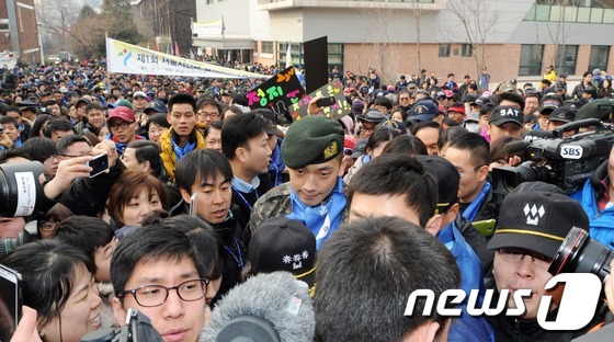가수 비(정지훈)가 19일 오후 서울 경복고등학교에서 열린 ‘제1회 서울시민과 함께하는 나라사랑 걷기대회’에서 참가자들과 함께 동행하고 있다. 앞서 비는 지난 1일 배우 김태희와의 열애설이 보도된 뒤 7일 간 복무규율 위반 등의 이유로 근신 처분을 받은 바 있다. 2013.1.19/뉴스1