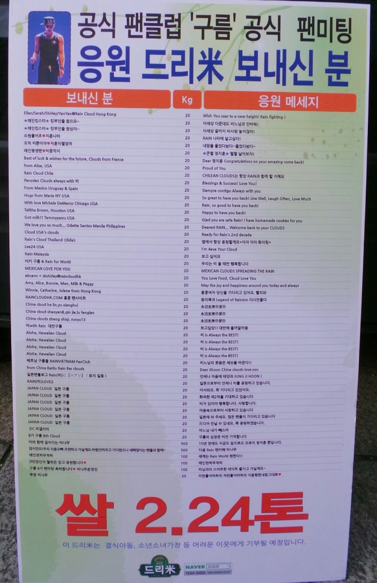 [images/clip] Rain’s 8th Cloud Fan Meet: Domestic and World Clouds donate 2.24 tons of food to charity. (10/12)