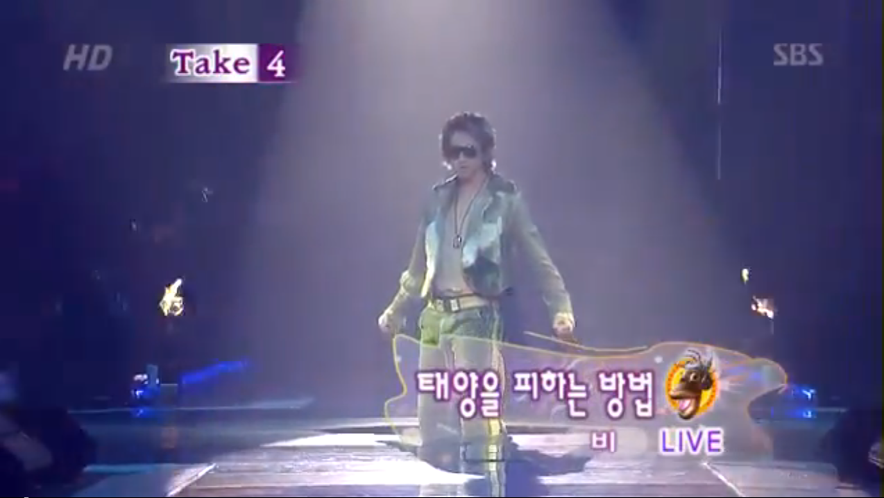 Two weeks following his first solo appearance on the Inkigayo stage, Rain was back again to try to avoid the sun. I always like to find different nuances from performance to performance – because they are there. It is safe to say that all of his music is most assuredly engrained into his genetic make up with each lyric and each choreographed move precise, crisp and in numbers like these, intense. But Rain is a versatile performer.