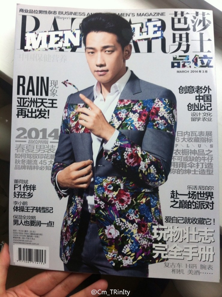 [images] Rain wears MCM on the cover and inside of Harper’s BAZAAR Men, March 2014.