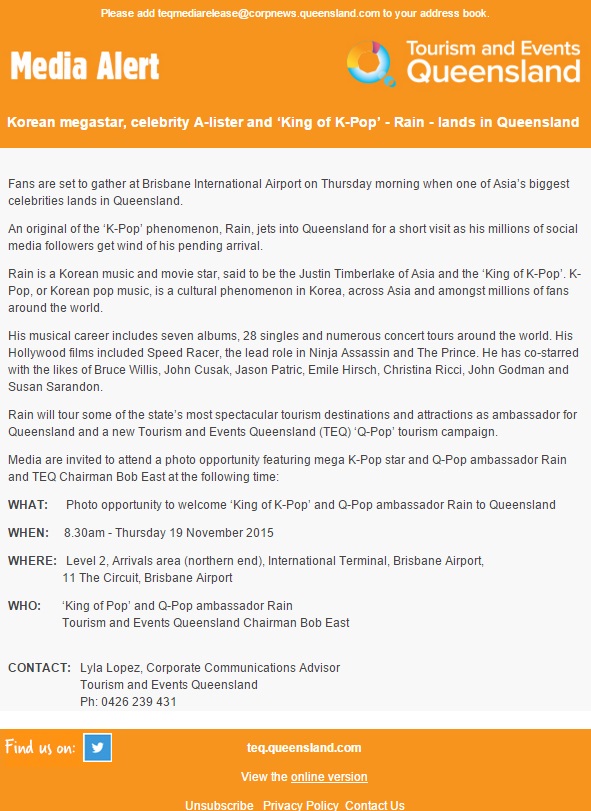 [17 images][bulletin][5 tweets][clip] “QPop” meets KPop: Queensland gives Rain a warm welcome. (11/18)