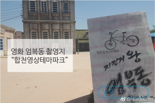 As far as I can tell, the caption on the left and the sign on the right say the same thing — Uhm Bok Dong movie location, “Hapcheon Image Theme Park.” ^@@^