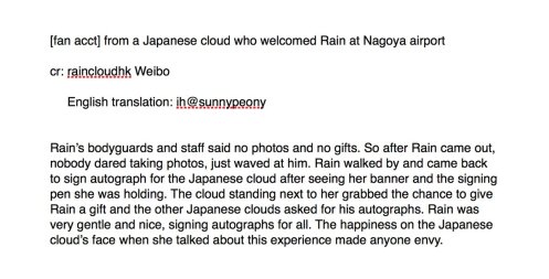 Enjoy this brief fan account from a Japanese Cloud who met Rain arriving in Japan at Nagoya Airport. (Big thanks to sunnypeony @ Twitter and raincloudhk @ Weibo!) Of course, Rain did what he wanted to do, regardless of what was said before he appeared, haha. No surprise there. He always does! That’s how he’s rolled for quite a while. I’m always so confused when people on social media bellyache about how he’s supposedly “manipulated”, forced to do things, needs his hand held, etc. When it comes to his life, his career, and his fans, nobody tells Rain what to do (except for the South Korean military, hahahaha). ^@@^